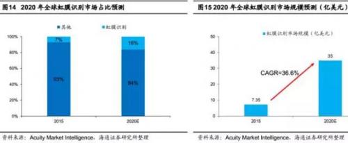 根據(jù)美國智庫Acuity Market Intelligence的報告顯示,虹膜識別在手機、平板電腦等消費級終端市場規(guī)模將增長的更快。預計 2020年全球生物識別市場將達到 218.7億美元,其中虹膜識別技術占全球生物特征識別的市場份額,將從2015年的7%提升至2020年的16%,2020年的總產(chǎn)值將達到35億美元,對應復合年均增速為36.6%。