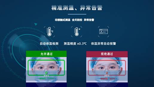 與門禁控制、考勤系統(tǒng)集成,非接觸式識別與測溫,體溫異常自動報警并拒絕開門。
